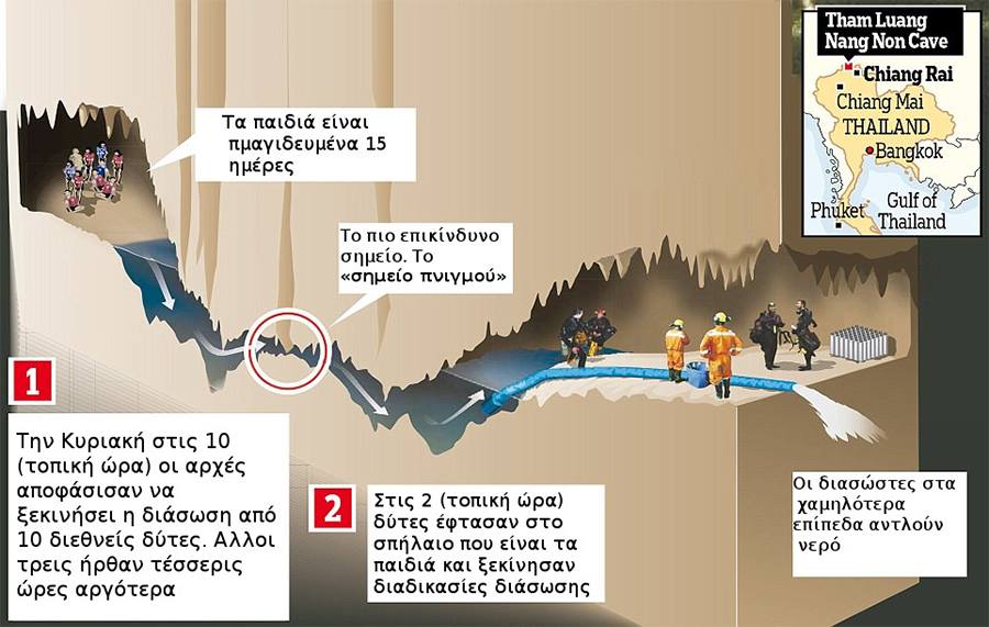 Κάπου εκεί ξεκινά μια αξιοσημείωτη προσπάθεια διάσωσης. Τα παιδιά πρέπει να οδηγηθούν στην έξοδο από έμπειρους δύτες, μέσα σε στενά και «ύπουλα» υποθαλάσσια περάσματα και από σημεία που χαρακτηρίζονταν ως «σημεία πνιγμού». Σε κάποιες περιπτώσεις τα περάσματα ήταν τόσο στενά που οι δεξαμενές οξυγόνου έπρεπε να αφαιρεθούν από την πλάτη τους.