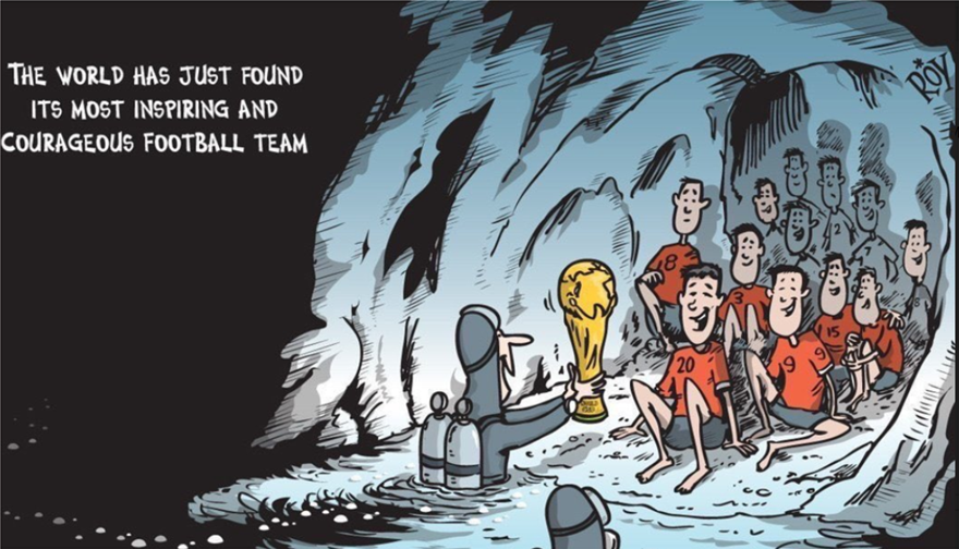 Οι σκιτσογράφοι πολλές φορές αποτυπώνουν με τρόπο συγκλονιστικό την επικαιρότητα. Τις τελευταίες ημέρες ολόκληρος ο πλανήτης κινείται στο ρυθμό δύο γεγονότων. Από τη μία η αγωνία για την τύχη των εγκλωβισμένων παιδιών στην Ταϊλάνδη και από την άλλη η τρελή φιέστα του Μουντιάλ. Ενας ταλαντούχος σκιτσογράφος συνδύασε αυτές τις δύο ειδήσεις με έναν πολύ συγκινητικό τρόπο.