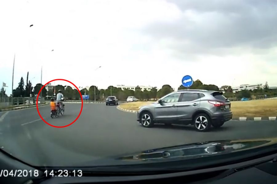 Ένα απίστευτο βίντεο κυκλοφορεί στα social media, από το απόγευμα της Δευτέρας, με έναν πατέρα ποδηλάτη, ο οποίος, προέβη σε μια απερίσκεπτη ενέργεια, έχοντας πίσω του το παιδί του, ανακόπτοντας την πορεία αυτοκινήτου, εντός του κυκλικού κόμβου του Γενικού Νοσοκομείου Λευκωσίας.