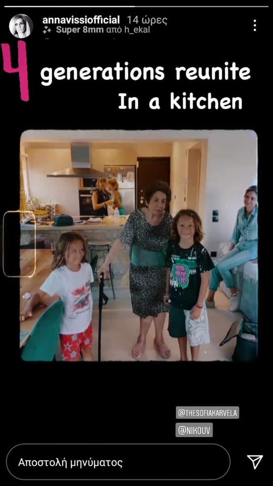 Η αγαπημένη Κύπρια τραγουδίστρια σε ανάρτησή της στον προσωπικό της λογαριασμό στο instagram δημοσίευσε μια οικογενειακή φωτογραφία, στην οποία, όπως κι η ίδια σχολίασε είναι 4 γενιές μαζί σε μια κουζίνα. Στη φωτογραφία απεικονίζεται η Άννα Βίσση με την αδερφή της Νίκη, στο βάθος, η μαμά τους Σοφία, η κόρη της Σοφία Καρβέλα και τα εγγόνια της Νέστορας και Νίκος.