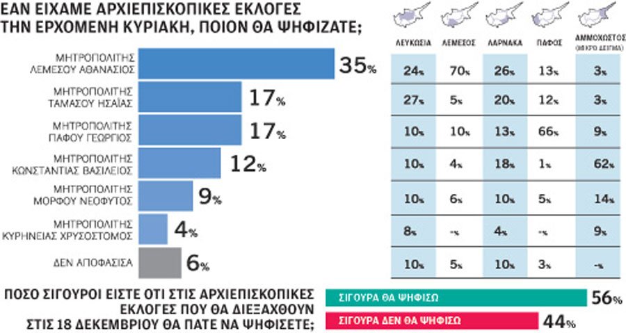 Η έρευνα της Symmetron Market Research που δημοσιεύτηκε στην εφημερίδα «Καθημερινή» στις 11 Δεκεμβρίου, έδειχνε τον Μητροπολίτη Λεμεσού πρώτο ενώ στην δεύτερη θέση ισοβαθμούσαν οι Μητροπολίτες Πάφου και Ταμασού. Στην τέταρτη θέση ήταν ο Μητροπολίτης Κωνσταντίας, στην πέμπτη θέση ο Μητροπολίτης Μόρφου και έκτος ο Μητροπολίτης Κυρηνείας. Το εκπληκτικό με τη συγκεκριμένη δημοσκόπηση δεν είναι η σειρά κατάταξης αλλά τα ποσοστά που έδινε στους έξι υποψηφίους.