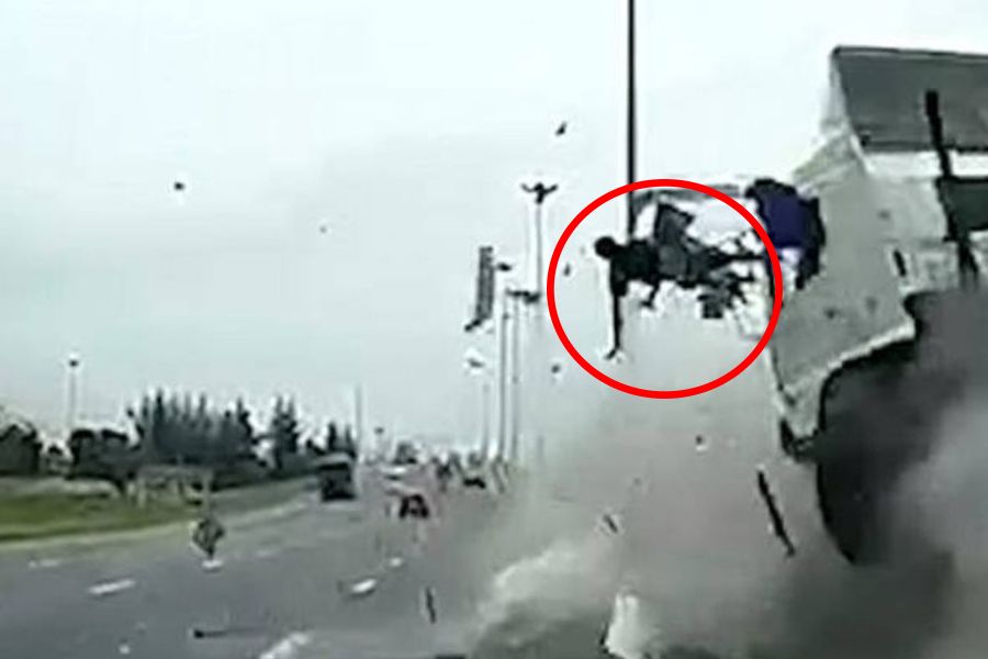 Αυτή είναι η τρομακτική στιγμή που ένας οδηγός φορτηγού εκτοξεύεται από την καμπίνα του φορτηγού και πέφτει πάνω σε ένα διερχόμενο αυτοκίνητο.