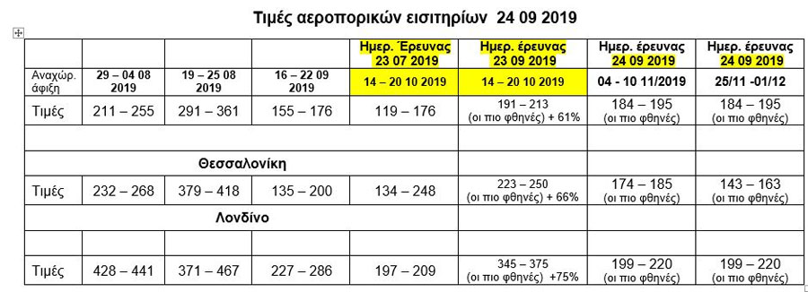 Συγκεκριμένα, έρευνα του Συνδέσμου, καταδεικνύει την απότομη αύξηση των τιμών με ενδεικτικά ποσοστά τα οποία ξεπερνούν τις φυσιολογικές τιμές με τις οποίες θα μπορούσε να ταξιδέψει κανείς όπως: Αθήνα (αύξηση 60-61%) , Θεσσαλονίκη (αύξηση 65-66%) και Λονδίνο (αύξηση 75%).