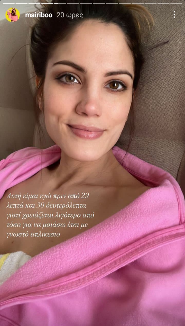 Στην πρώτη φωτογραφία ποζάρει απόλυτα φυσική σχολιάζοντας: «Αυτή είμαι εγώ πριν 30 λεπτά. Κανένα φίλτρο/μεικ απ. Αλλά ωραίο φως από το παράθυρο».
