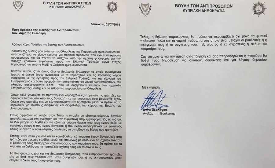 Όπως καλά γνωρίζετε τα προτεινόμενα νομοσχέδια εξυπηρετούν τις τράπεζες και αφαιρούν δικαιώματα από τους δανειολήπτες και επομένως όσοι βουλευτές έχουν δάνεια στις τράπεζες είτε μη εξυπηρετούμενα είτε εξυπηρετούμενα θα πρέπει να το δηλώσουν για σκοπούς διαφάνειας και διαφύλαξης του κύρους της Βουλής των Αντιπροσώπων.