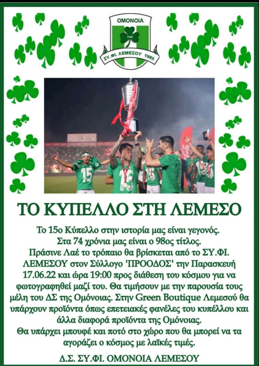 Για την εκδήλωση που θα γίνει την ερχόμενη Παρασκευή (17/06) στη Λεμεσό ενημέρωσε η Ομόνοια, με τους φίλους της ομάδας να έχουν την ευκαιρία να δουν από κοντά το κύπελλο που κατέκτησε πριν μερικές εβδομάδες το «τριφύλλι».
