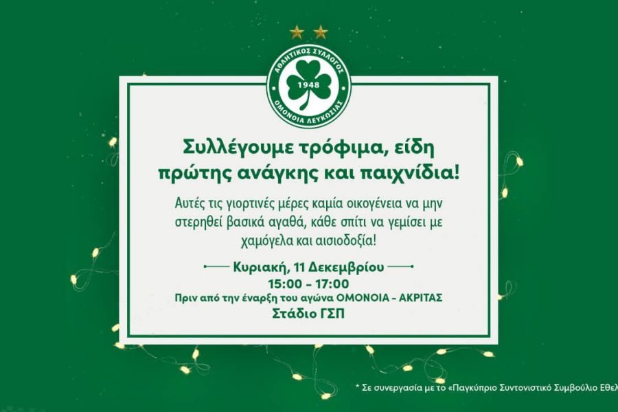 Η συλλογή θα πραγματοποιηθεί την ερχόμενη Κυριακή, 11 Δεκεμβρίου, έξω από τη Δυτική κερκίδα του σταδίου ΓΣΠ, πριν από την έναρξη του αγώνα μας με τον Ακρίτα Χλώρακας, από τις 15:00 μέχρι τις 17:00.