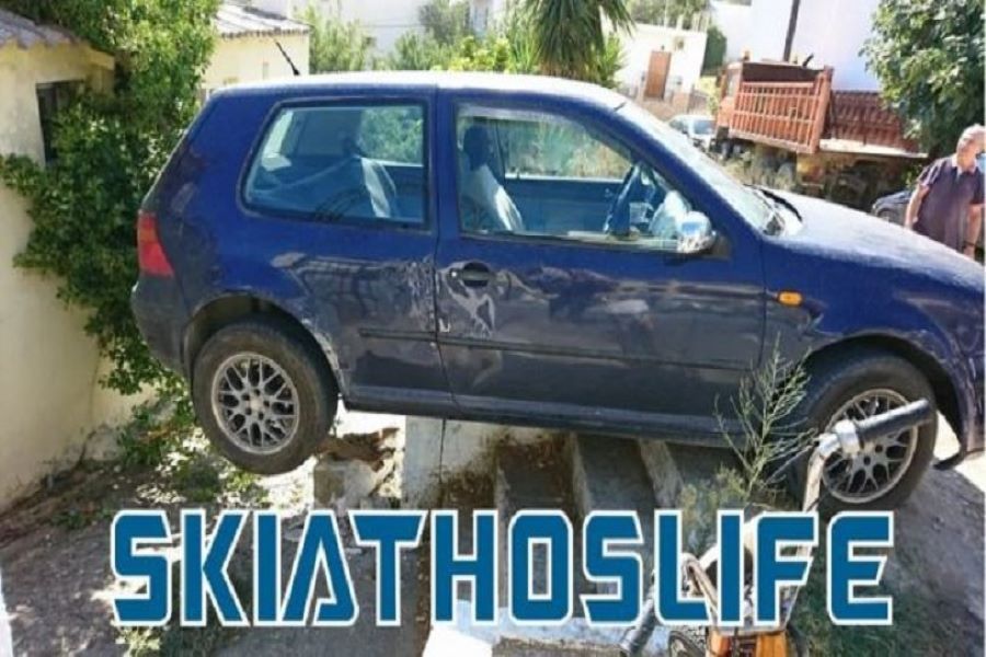 Έντρομοι οι περαστικοί, είδαν το μεσημέρι της Πέμπτης (20/8) ένα μπλε σκούρο αυτοκίνητο μάρκας Volkswagen να σπάει το προστατευτικό τοιχίο οικίας και να βρίσκεται στην κυριολεξία στον αέρα μεταξύ του σπιτιού και παράπλευρου οικοπέδου, στην περιοχή Ακρόπολη, στη Σκιάθο.