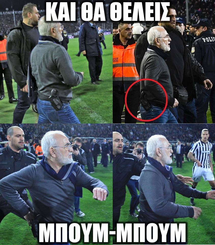 Σίγουρα οι εικόνες που κάνουν τον γύρο του διαδικτύου από το χθεσινό παιχνίδι στην Τούμπα δείχνουν για άλλη μια φορά την κατάντια του Ελληνικού Πρωταθλήματος. Όμως το περιστατικό με την «εισβολή» του Ιβαν Σαββίδη στο γήπεδο με το όπλο να είναι στην θήκη δεν θα μπορούσε να περάσει ασχολίαστο από τα γνωστά τρολ που δεν αφήνουν τίποτα να πέσει κάτω.