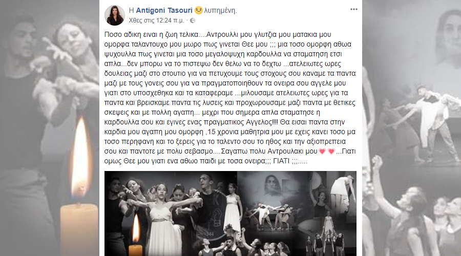 «Ποσο αδικη ειναι η ζωη τελικα....Αντρουλλι μου γλυτζια μου ματακια μου ομορφα ταλαντουχο μου μωρο πως γινεται Θεε μου ;;; μια τοσο ομορφη αθωα ψυχουλλα πως γινεται μια τοσο μεγαλοψυχη καρδουλλα να σταματηση ετσι απλα...δεν μπορω να το πιστεψω δεν θελω να το δεχτω ...ατελειωτες ωρες δουλειας μαζι στο στουτιο για να πετυχουμε τους στοχους σου καναμε τα παντα μαζι με τους γονεις σου για να πραγματοποιηθουν τα ονειρα σου αγγελε μου γιατι στο υποσχεθηκα και τα καταφεραμε ...μιλουσαμε ατελειωτες ωρες για τα παντα και βρεισκαμε παντα τις λυσεις και προχωρουσαμε μαζι παντα με θετικες σκεψεις και με πολλη αγαπη... μεχρι που σημερα απλα σταματησε η καρδουλλα σου και εγινες ενας πραγματικος Αγγελος!!! Θα εισαι παντα στην καρδια μου αγαπη μου ομορφη ,15 χρονια μαθητρια μου με εχεις κανει τοσο μα τοσο περηφανη και το ξερεις για το ταλεντο σου το ηθος και την αξιοπρεπεια σου και παντοτε με πολυ σεβασμο....Σαγαπω πολυ Αντρουλακι μου...Γιατι ομως Θεε μου γιατι ενα αθωο παιδι με τοσα ονειρα;;; ΓΙΑΤΙ ;;;.....»