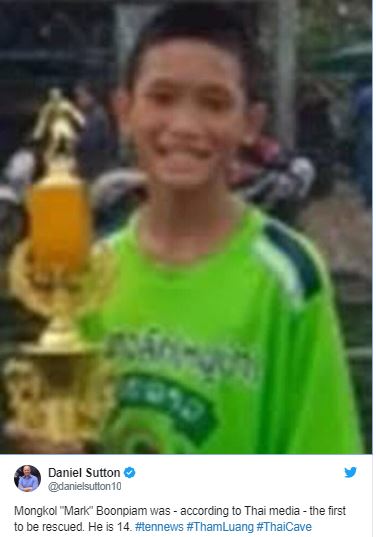 Σύμφωνα με τον δημοσιογράφο Daniel Shutton, απεσταλμένο του αυστραλιανού network ten, το πρώτο παιδί που απεγκλωβίστηκε από το σπήλαιο είναι ο Mongkol "Mark" Boonpiam, ηλικίας 14 ετών.