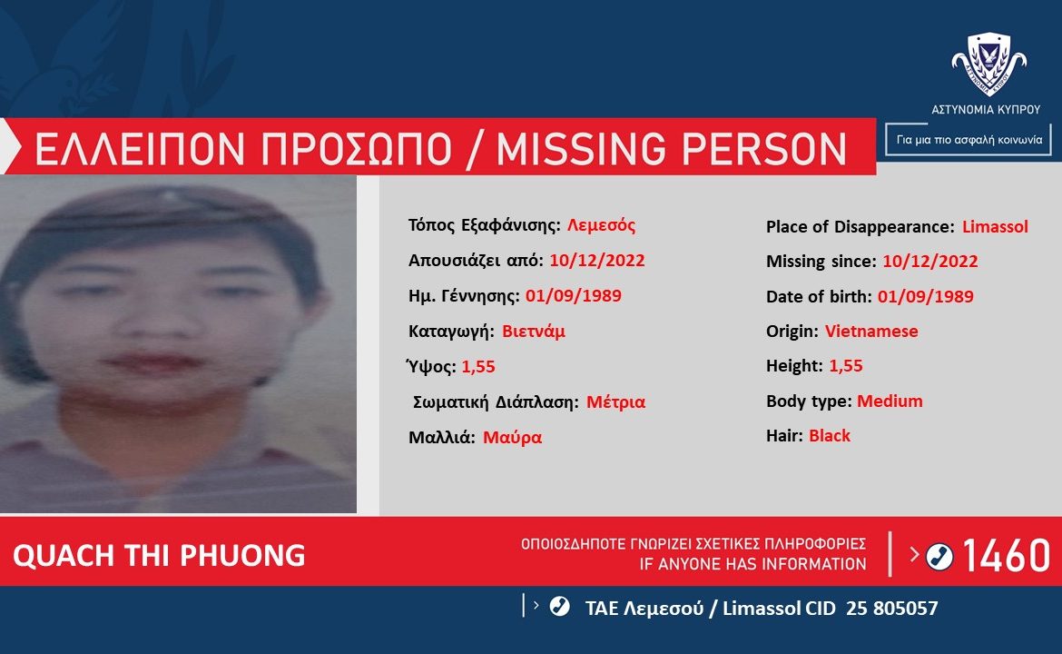 Η Αστυνομία ζητά πληροφορίες που μπορούν να βοηθήσουν στον εντοπισμό της QUACH THI PHUONG, 33 ετών από το Βιετνάμ, η οποία απουσιάζει από τις 10 Δεκεμβρίου, 2022, από τον χώρο διαμονής της στην επαρχία Λεμεσού.