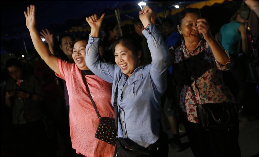 Χειροκροτήματα, κραυγές χαράς, κόρνες παρατεταμένες και live βίντεο: Το εορταστικό κλίμα και οι ξέφρενοι πανηγυρισμοί έχουν «πλημμυρίσει» την πόλη Τσιάνγκ Ράι στη βόρεια Ταϊλάνδη αλλά και πολλές άλλες περιοχές, μετά τη διάσωση των 12 αγοριών και του προπονητή τους από το σπήλαιο Ταμ Λουάνγκ.
