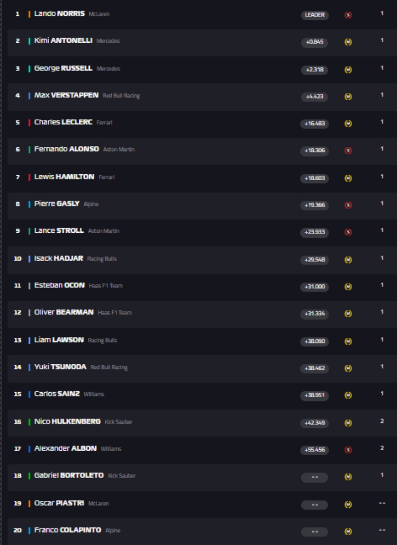 Όσον αφορά το podium, η Μercedes έκανε αισθητή την παρουσία της δίνοντας συνέχεια στην καλή της εικόνα από τις χθεσινές ελεύθερες δοκιμές και κατατακτήριες δοκιμές, με τον Κίμι Αντονέλι και τον Τζορτζ Ράσελ να τερματίζουν στη 2η και 3η θέση. Τέλος, ο Μαξ Φερστάπεν, που παραμένει ζωντανός στη μάχη του τίτλου, μείωσε τη «ζημιά» και από την 6η θέση που εκκίνησε, τερμάτισε στην τέταρτη, προσθέτοντας 5 βαθμούς στη συγκομιδή του.