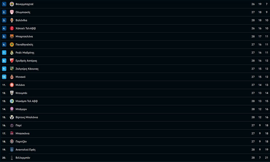 Η βαθμολογία της Euroleague:
