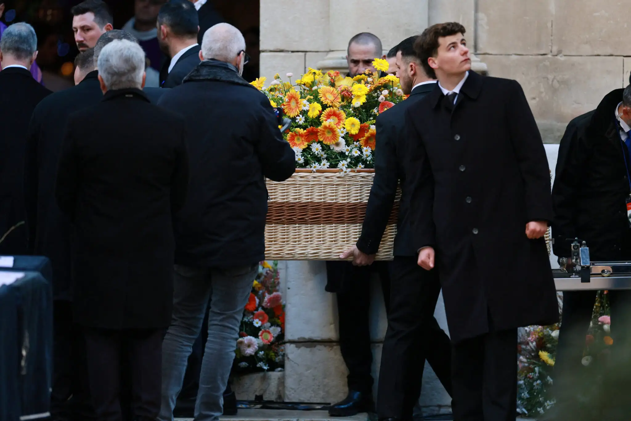 Το φέρετρο ήταν διακοσμημένο με πολύχρωμα άνθη, ενώ στον χώρο ακούστηκε το «Ave Maria» με τη φωνή της Μαρίας Κάλλας, ενισχύοντας το φορτισμένο κλίμα της τελετής.