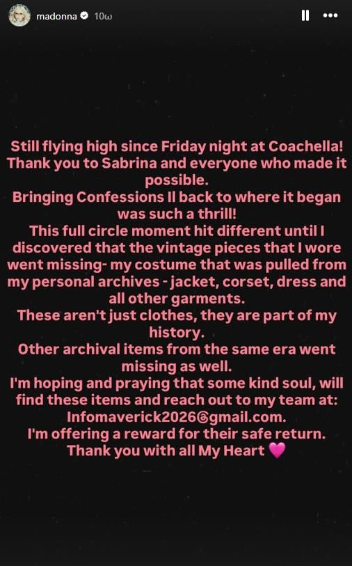 Έκκληση για την «ασφαλή επιστροφή» ενός ιδιαίτερα συμβολικού κομματιού της προσωπικής της συλλογής απηύθυνε η Μαντόνα (Madonna), μετά την εξαφάνιση του vintage outfit που φόρεσε στην πρόσφατη εμφάνισή της στο Coachella, δίπλα στη Σαμπρίνα Κάρπεντερ (Sabrina Carpenter).