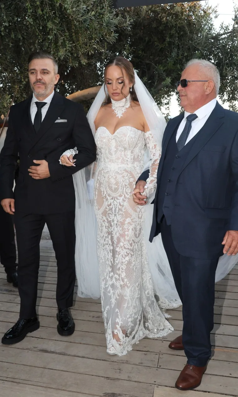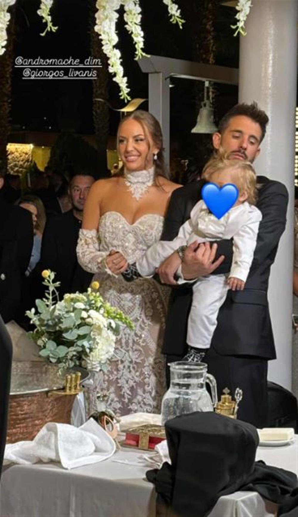 Η Ανδρομάχη φόρεσε ένα εντυπωσιακό custom νυφικό δια χειρός Βρεττού Βρεττάκου. Ο ίδιος σχεδιαστής έφτιαξε και το φόρεμά της για τη δεξίωση.
