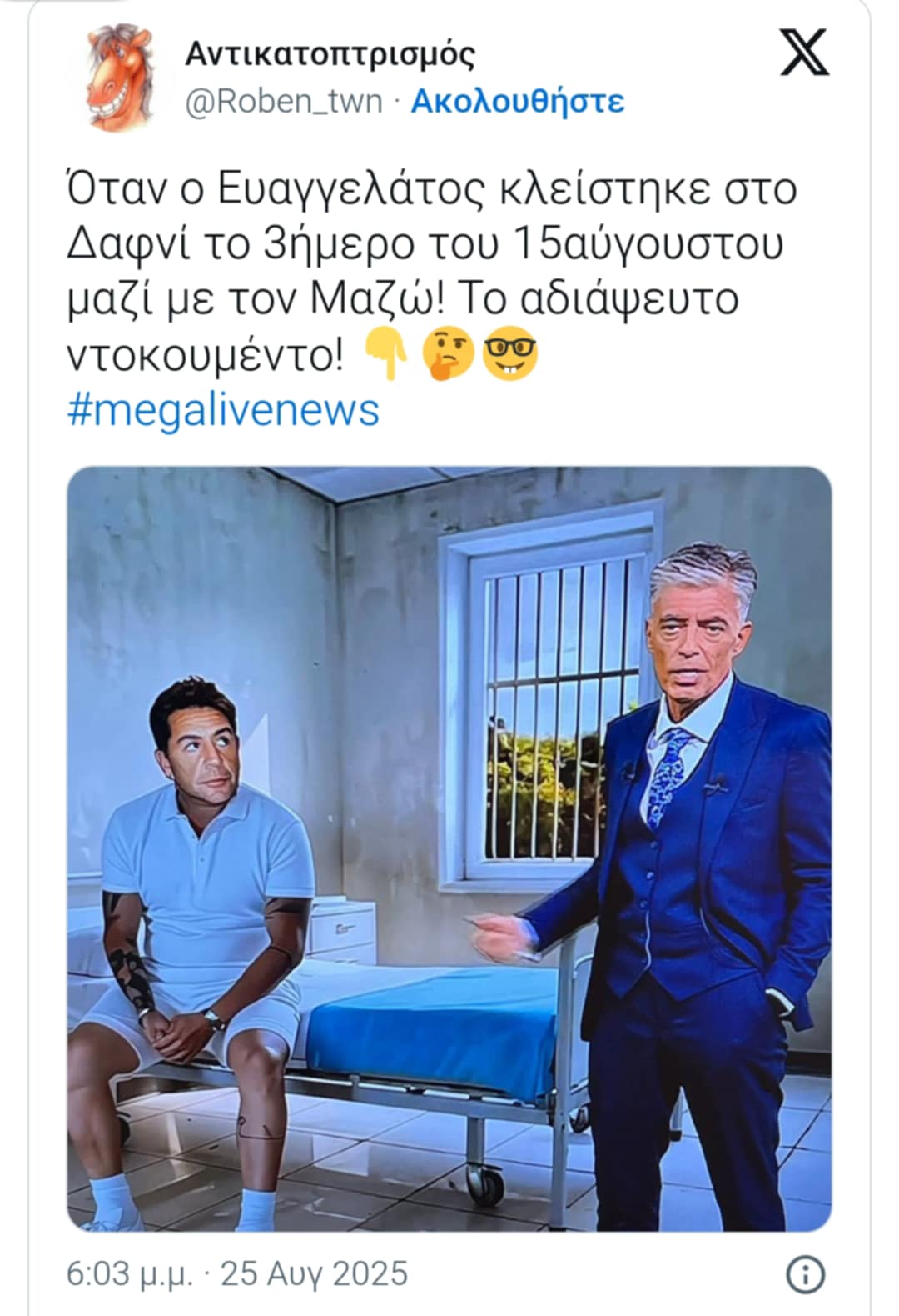 Εκτός από το αναλυτικό ρεπορτάζ και τις μαρτυρίες, ο Νίκος Ευαγγελάτος εμφανίστηκε σε ακόμα μια 3D απεικόνιση, που ήδη συζητείται έντονα στα social media. Τι συνέβη; Ο παρουσιαστής εμφανίστηκε με τη βοήθεια της τεχνολογίας μέσα στο δωμάτιο του Γιώργου Μαζωνάκη στο Δρομοκαΐτειο.