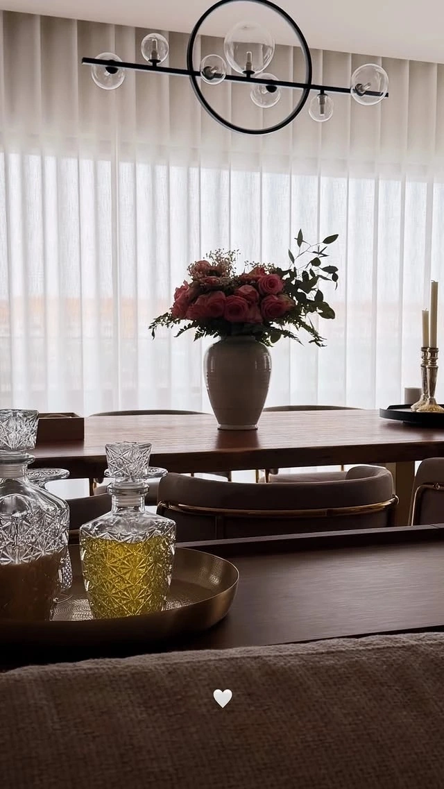 Κεντρικό στοιχείο αποτελεί η μεγάλη τραπεζαρία με αναπαυτικές καρέκλες σύγχρονου σχεδιασμού, ενώ στο κέντρο δεσπόζει ένα λευκό βάζο με φρέσκα λουλούδια —ένα μικρό, αλλά χαρακτηριστικό δείγμα της αγάπης της για λεπτομέρειες που δίνουν ζωντάνια και προσωπικότητα στον χώρο της.