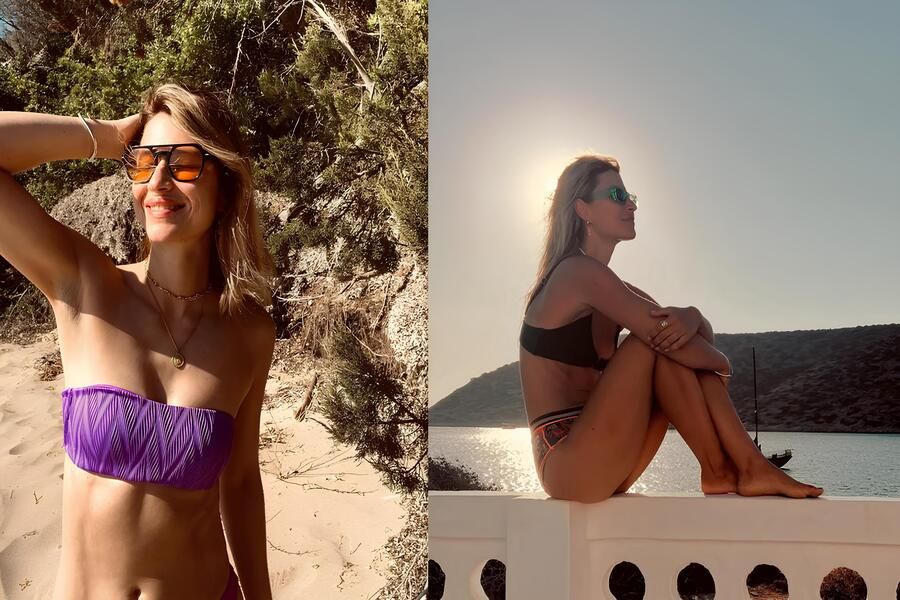 Η ηθοποιός φορά τα χρωματιστά μπικίνι της που αναδεικνύουν την τέλεια σιλουέτα της και απολαμβάνει τον ήλιο και τη θάλασσα.