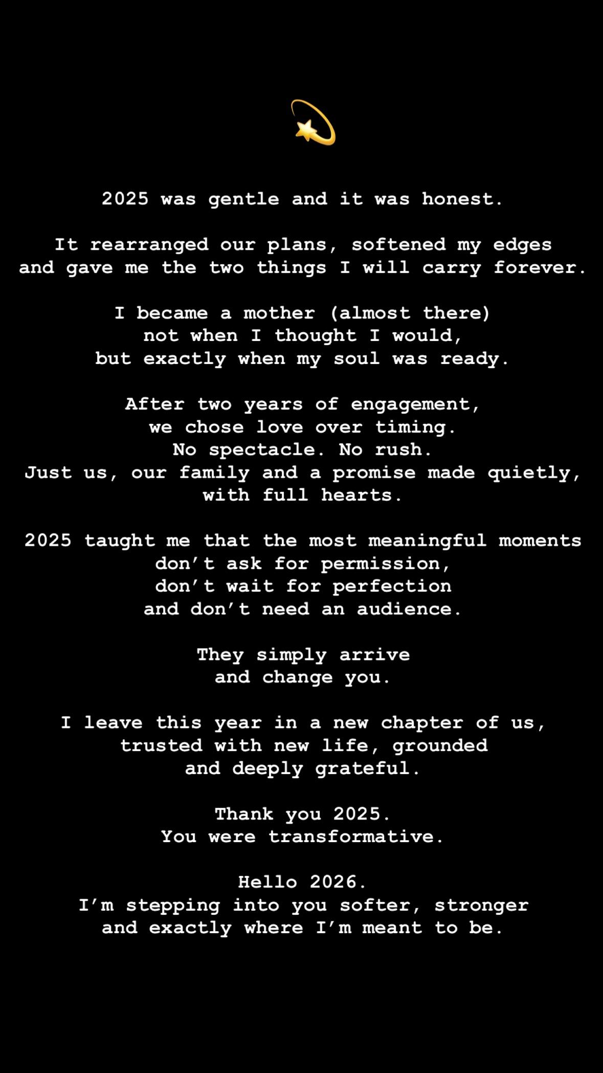 Μόνο εμείς, η οικογένειά μας και μια υπόσχεση που δόθηκε αθόρυβα, με γεμάτες καρδιές. Το 2025 μού έμαθε ότι οι πιο ουσιαστικές στιγμές δεν ζητούν άδεια, δεν περιμένουν την τελειότητα και δεν χρειάζονται κοινό. Απλώς έρχονται και σε αλλάζουν. Αφήνω αυτή τη χρονιά μπαίνοντας σε ένα νέο κεφάλαιο της ζωής μας, κρατώντας μέσα μου μια νέα ζωή, γείωση και βαθιά ευγνωμοσύνη. Σε ευχαριστώ, 2025. Ήσουν μεταμορφωτικό. Γεια σου, 2026. Σε υποδέχομαι πιο απαλή, πιο δυνατή και ακριβώς εκεί που πρέπει να βρίσκομαι».