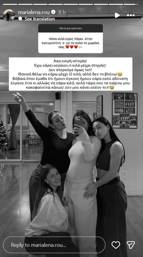 Παράλληλα, μίλησε ανοιχτά και για την αλλαγή στο σώμα της, αποκαλύπτοντας τα κιλά που έχει πάρει στον πέμπτο μήνα της εγκυμοσύνης της, τονίζοντας ότι δεν στερείται τίποτα, αλλά έχει βάλει έναν προσωπικό στόχο: «Ααα πικρή ιστορία! Έχω πάρει περίπου 6 κιλά μέχρι στιγμής! Δεν στερούμαι όμως τίποτα! Ιδανικά θέλω να πάρω μέχρι 12 κιλά, αλλά δεν το βλέπω! Βέβαια όταν έμαθα ότι ήμουν έγκυος ήμουν πάρα πολύ αδύνατη, έπρεπε έτσι κι αλλιώς να πάρω κιλά, απλά τώρα που τα παίρνω μου κακοφαίνεται κάπως! Δεν μου κάνει πλέον τίποτα!».