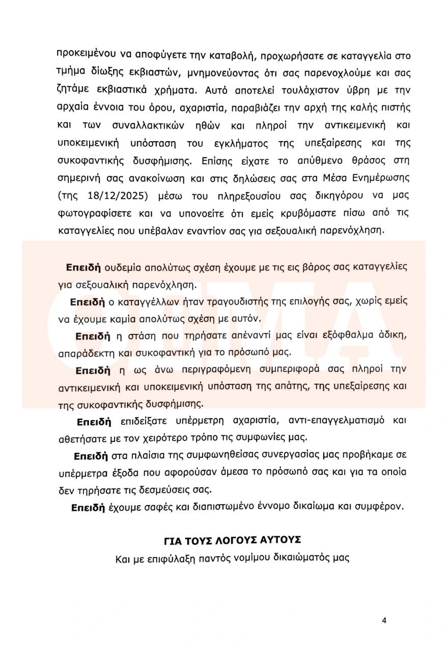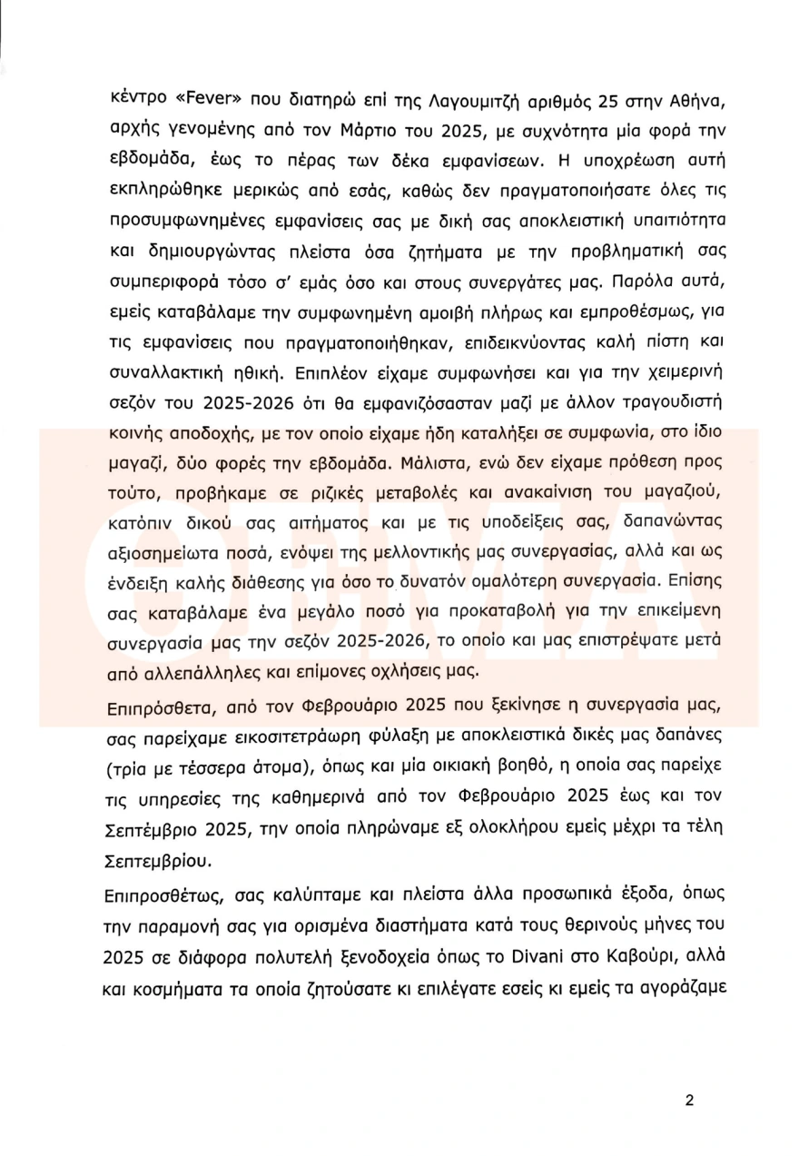 Κατόπιν όλων αυτών, αντί να προσέλθετε για την προσυμφωνημένη συνεργασία μας που θα ξεκινούσε τον Οκτώβρη-Νοέμβρη του 2025, αρχίσατε να συζητάτε και να διαπραγματεύεστε την περίοδο εκείνη με τρίτους για εμφανίσεις σας σε άλλα νυχτερινά κέντρα και συγχρόνως μας κοροϊδεύατε και βρίσκατε διαρκώς προφάσεις ώστε να αναβάλλεται και να καθυστερεί η δική μας συνεργασία. Μας δηλώσατε ότι δεν επιθυμείτε να υπάρξει δεύτερος τραγουδιστής μαζί σας, σε πλήρη αντίθεση με όσα είχαμε αρχικά συμφωνήσει. Στο σημείο αυτό σταμάτησε οποιαδήποτε επαφή μας και πληροφορούμασταν από τρίτους και Μέσα Ενημέρωσης ότι συζητούσατε με άλλους επιχειρηματίες και άλλα μαγαζιά.
