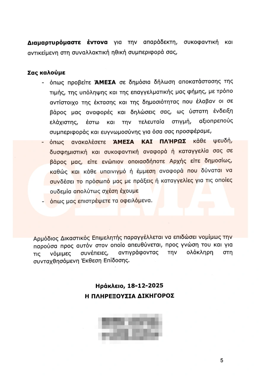 – όπως ανακαλέσετε ΑΜΕΣΑ ΚΑΙ ΠΛΗΡΩΣ κάθε ψευδή, δυσφημιστική και συκοφαντική αναφορά ή καταγγελία σας σε βάρος μας, είτε ενώπιον οποιασδήποτε Αρχής είτε δημοσίως, καθώς και κάθε υπαινιγμό ή έμμεση αναφορά που δύναται να συνδέσει το πρόσωπό μας με πράξεις ή καταγγελίες για τις οποίες ουδεμία απολύτως σχέση έχουμε,