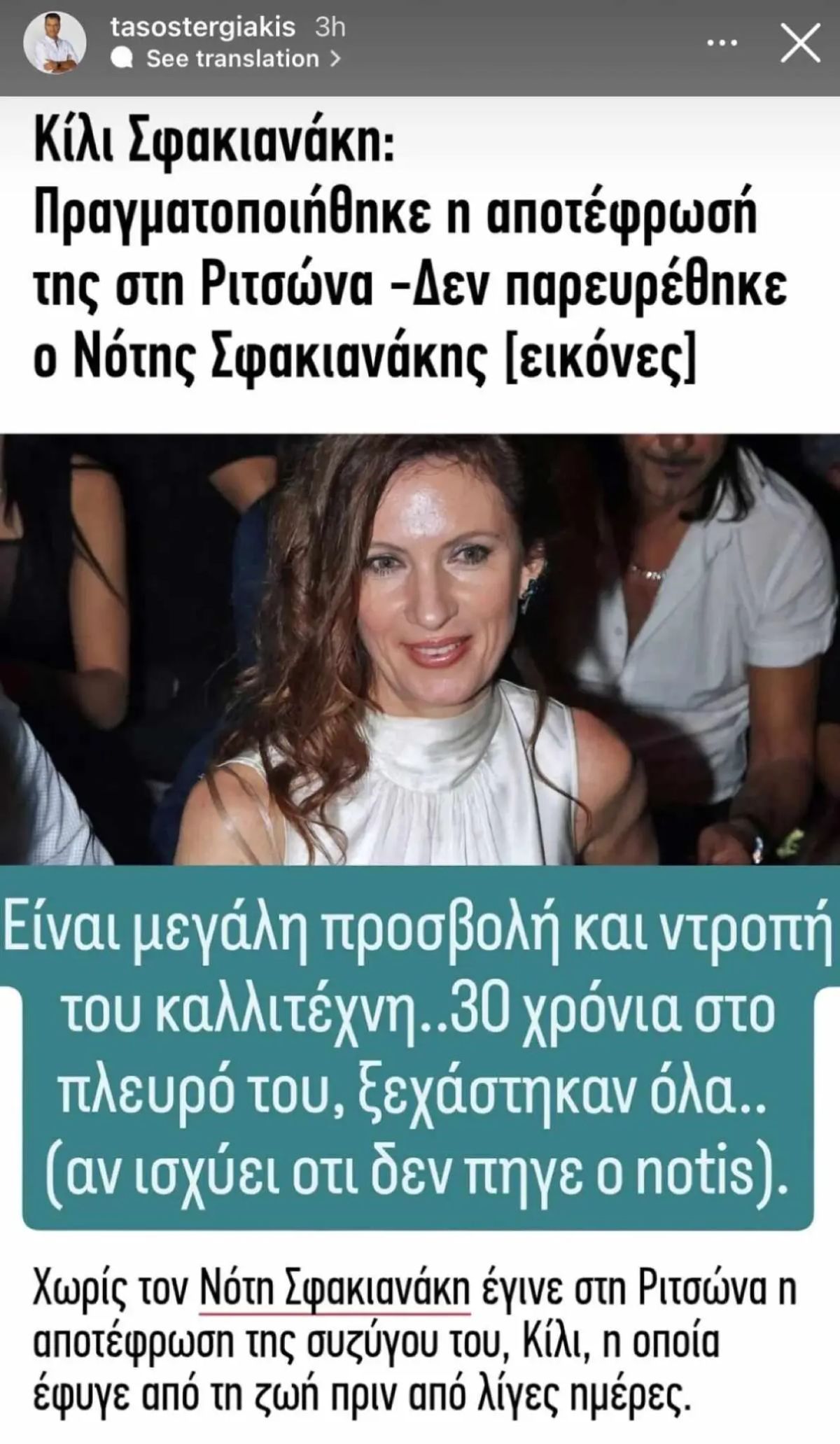 Ο γνωστός δημοσιογράφος εξέφρασε τη δυσαρέσκειά του προς τον Νότη Σφακιανάκη, με αφορμή τις πληροφορίες που κυκλοφορούν και αναφέρουν ότι ο τραγουδιστής δεν παρευρέθηκε στην κηδεία της συζύγου του, Κίλι Σφακιανάκη.