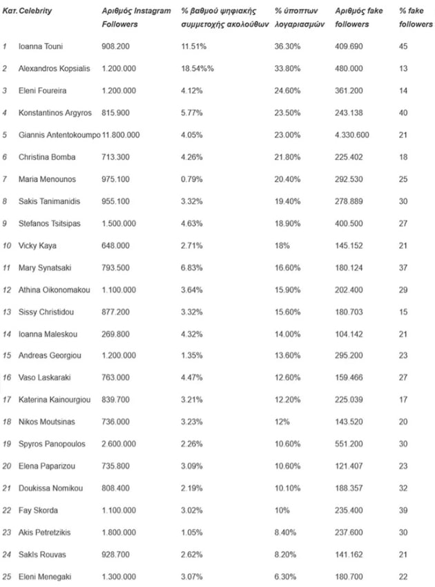 Σύμφωνα με τη μελέτη, στην Ελλάδα η Ιωάννα Τούνη, ο Αλέξανδρος Κοψιάλης και η Ελένη Φουρέιρα έχουν τους περισσότερους fake followers στο Instagram με σχεδόν 25-37% ύποπτων λογαριασμών στο προφίλ τους!