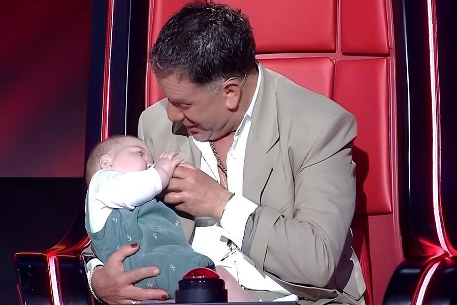 Η νεαρή παίκτρια δεν μπορούσε παρά να είναι χαρούμενη που το παιδί της καθόταν ήρεμο στα χέρια του τραγουδιστή κι ας μη γύρισε ο ίδιος την καρέκλα του για να τη διεκδικήσει στην ομάδα του.