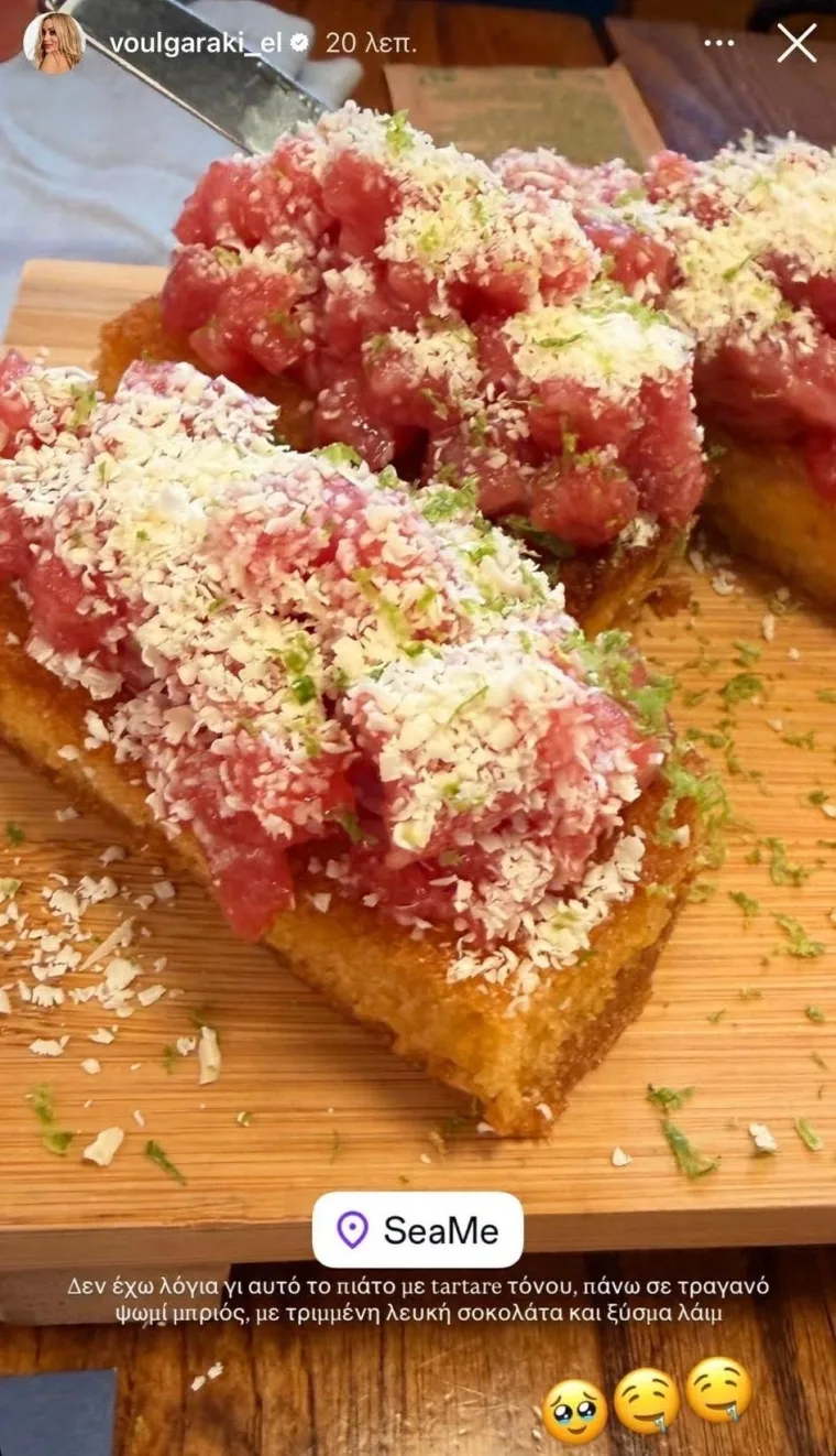 Σε πρόσφατη έξοδό της στο εστιατόριο SeaMe, η παρουσιάστρια δοκίμασε ένα πιάτο που ξεφεύγει από τα κλασικά και δεν έκρυψε τον ενθουσιασμό της, χαρακτηρίζοντάς το «χωρίς λόγια».
