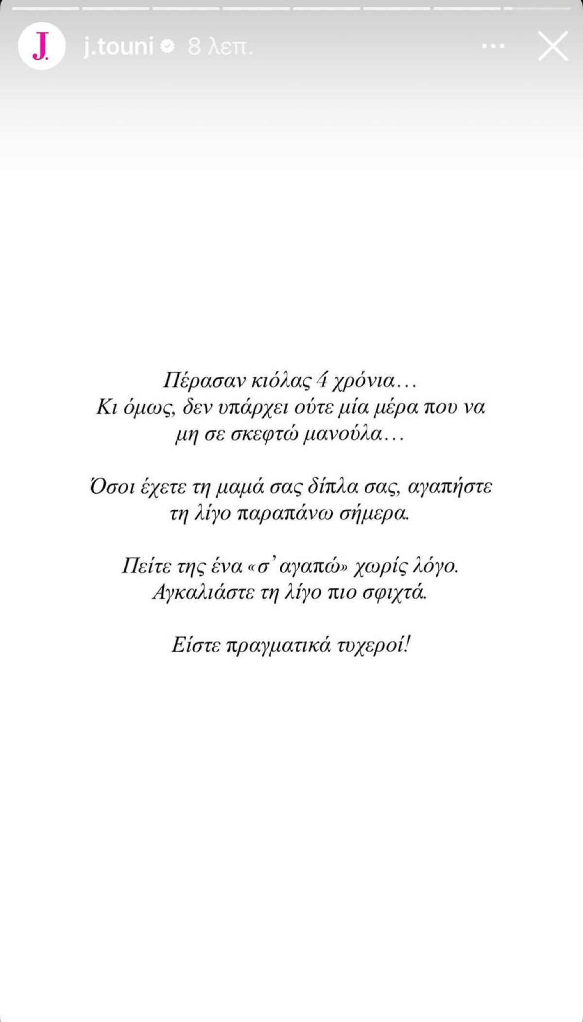 Αφού δημοσίευσε μια κοινή τους φωτογραφία, αμέσως μετά έγραψε: «Πέρασαν κιόλας 4 χρόνια… Κι όμως, δεν υπάρχει ούτε μία μέρα που να μη σε σκεφτώ μανούλα… Όσοι έχετε τη μαμά σας δίπλα σας, αγαπήστε τη λίγο παραπάνω σήμερα. Πείτε της ένα "σ’ αγαπώ" χωρίς λόγο. Αγκαλιάστε τη λίγο πιο σφιχτά... Είστε πραγματικά τυχεροί!»