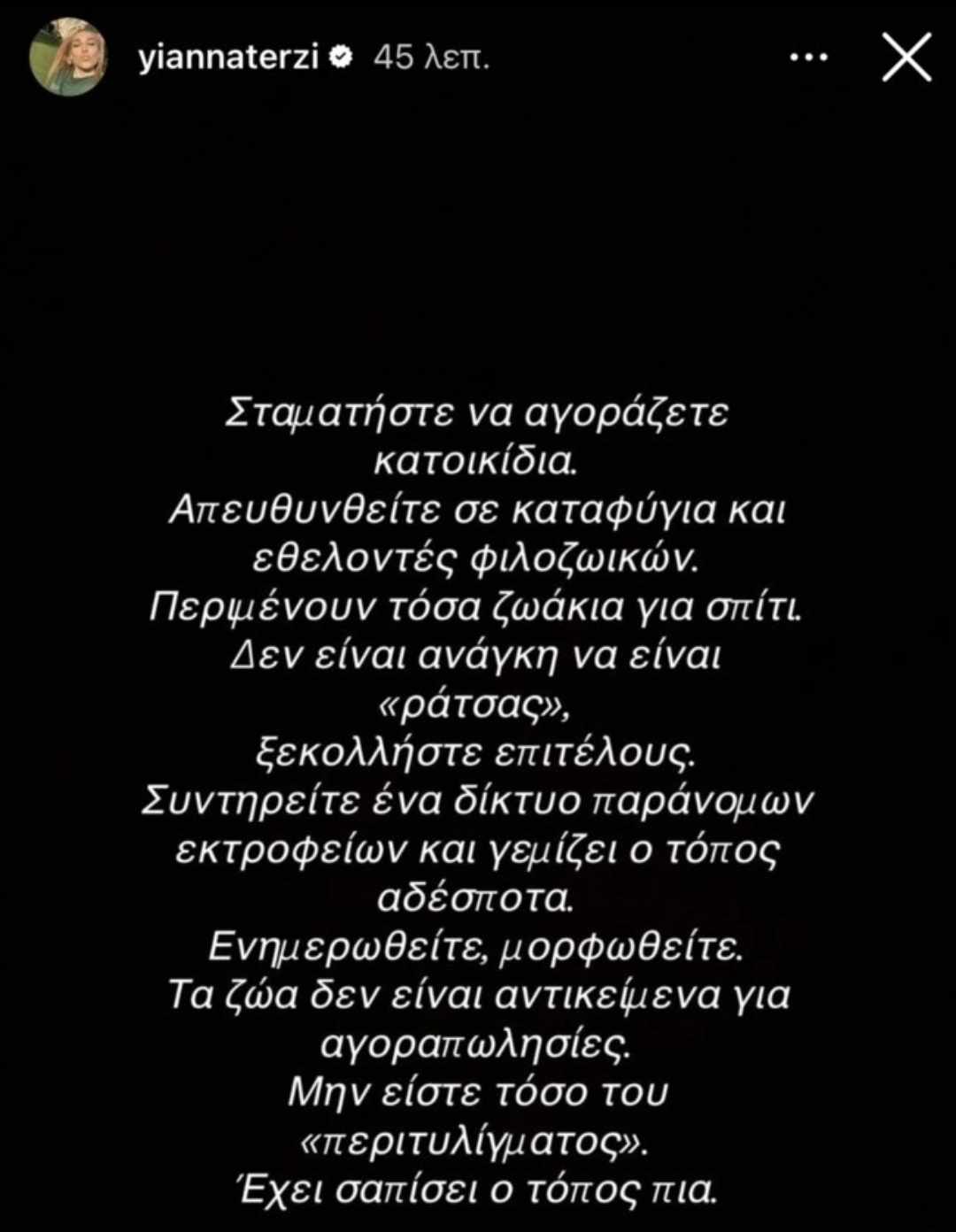 "Σταματήστε να αγοράζετε κατοικίδια. Απευθυνθείτε σε καταφύγια και εθελοντές φιλοζωικών. Περιμένουν τόσα ζωάκια για σπίτι. Δεν είναι ανάγκη να είναι "ράτσας", ξεκολλήστε επιτέλους. Συντηρείτε ένα δίκτυο παράνομων εκτροφείων και γεμίζει ο τόπος αδέσποτα. Ενημερωθείτε, μορφωθείτε. Τα ζώα δεν είναι αντικείμενα για αγοραπωλησίες. Μην είστε τόσο του "περιτυλίγματος". Έχει σαπίσει ο τόπος, πια".