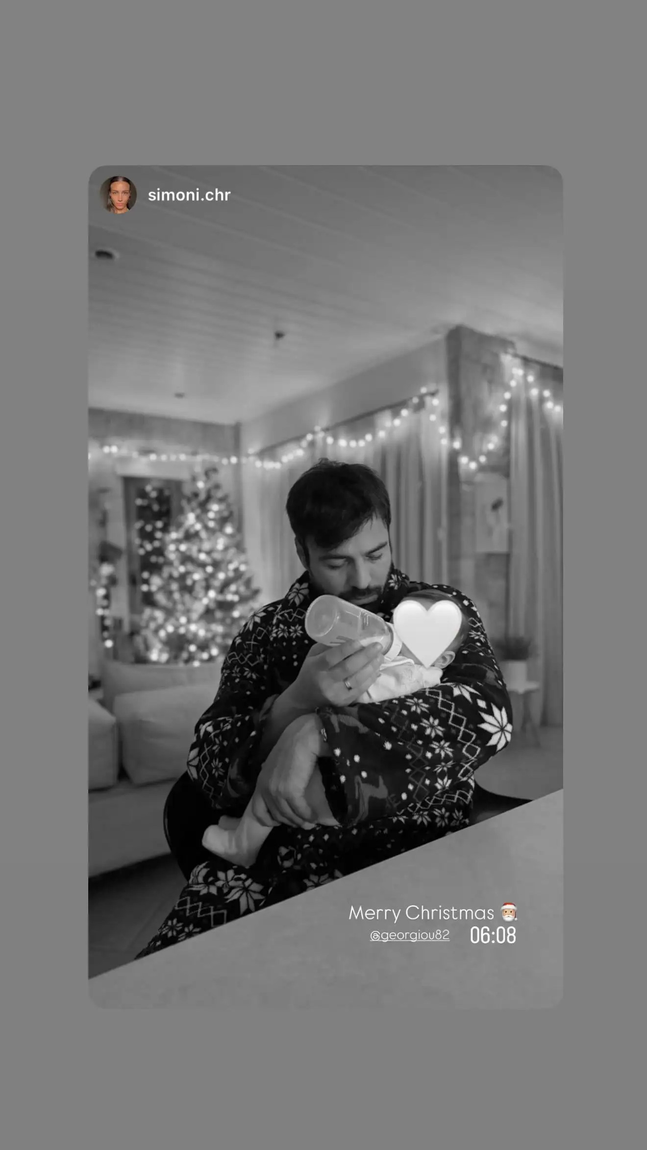 Στο ασπρόμαυρο στιγμιότυπο, που ανέβηκε νωρίς το πρωί της 25ης Δεκεμβρίου, ο Αντρέας Γεωργίου κρατά στην αγκαλιά του τη νεογέννητη κόρη του και τη φροντίζει ταΐζοντάς τη με μπιμπερό, έχοντας στο φόντο το στολισμένο χριστουγεννιάτικο δέντρο του σπιτιού τους.