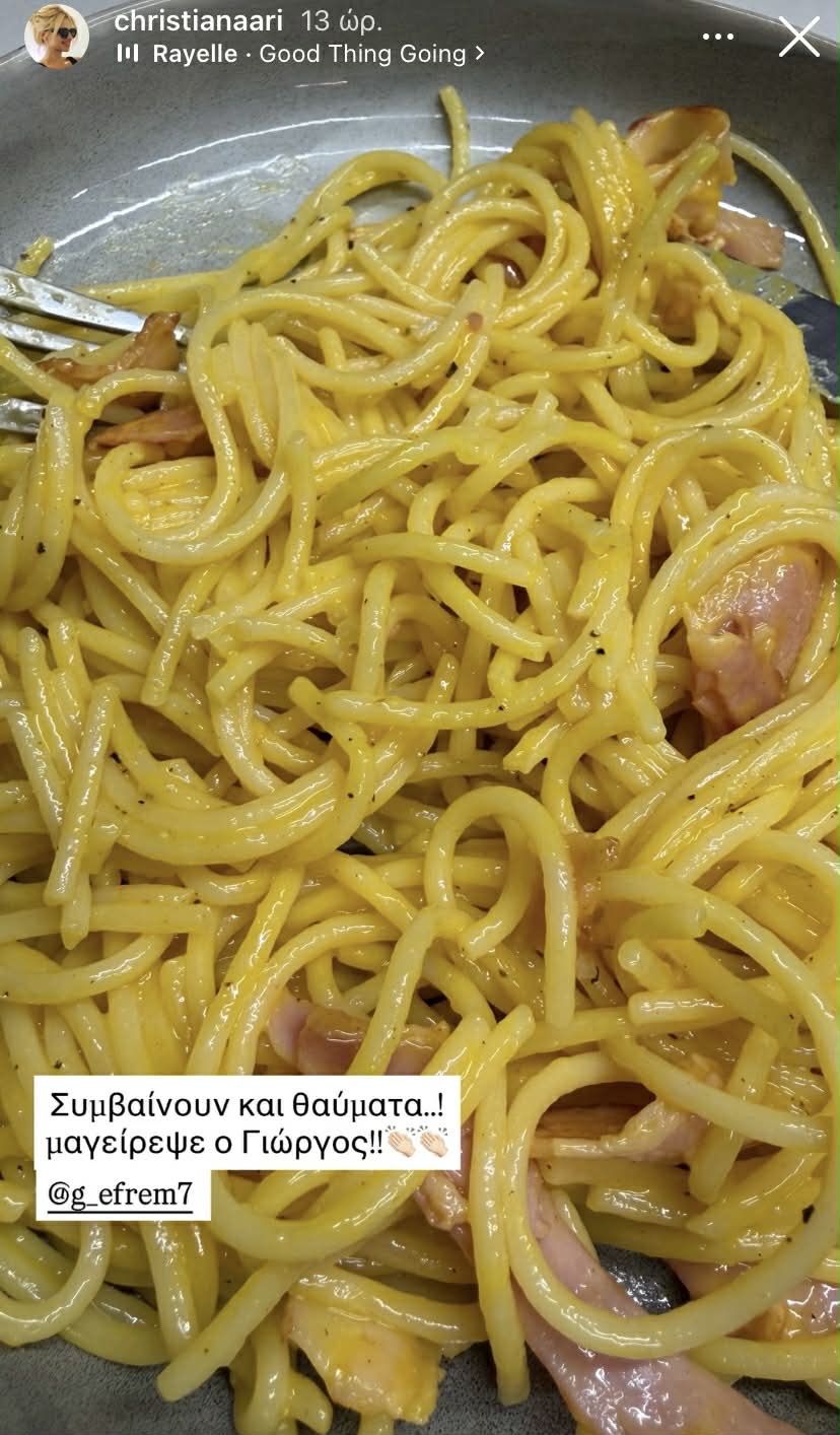 «Συμβαίνουν και θαύματα. Μαγείρεψε ο Γιώργος», έγραψε η Χριστιάνα Αριστοτέλους.