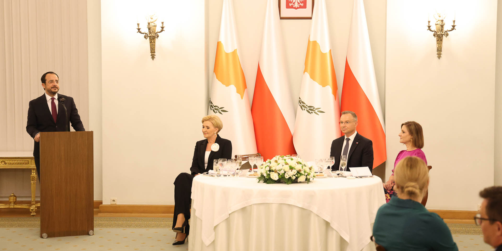 Το βράδυ της Πέμπτης, ο Πρόεδρος Χριστοδουλίδης, η σύζυγος του και τα μέλη της κυπριακής αντιπροσωπείας παρακάθισαν σε επίσημο δείπνο, το οποίο παρέθεσε ο Πρόεδρος Ντούντα. Για το επίσημο δείπνο, η Πρώτη Κυρία επέλεξε μια ανοιξιάτικη εμφάνιση και πιο συγκεκριμένα, μια φλοράλ μάξι φούστα την οποία συνδύασε με σατέν φούξια τοπ. Πιστή στην διαχρονικότητα, η Agata Kornhauser-Duda εντυπωσίασε φορώντας ένα μαύρο κουστούμι μαζί με λευκό τοπ και μαύρες γόβες, ενώ θέλοντας να κάνει την εμφάνισή της πιο μοντέρνα, πρόσθεσε ένα λευκό λουλούδι.