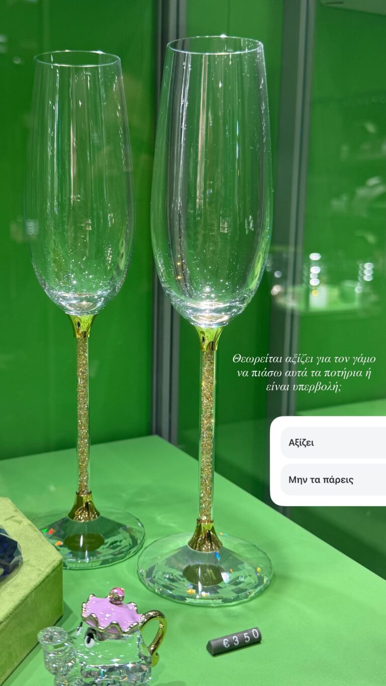 Τα εν λόγω ποτήρια, έχουν μια εντυπωσιακή βάση με χρυσές λεπτομέρειες, τα οποία όπως είδαμε στο καρτελάκι της τιμής κοστίζουν 350 ευρώ.