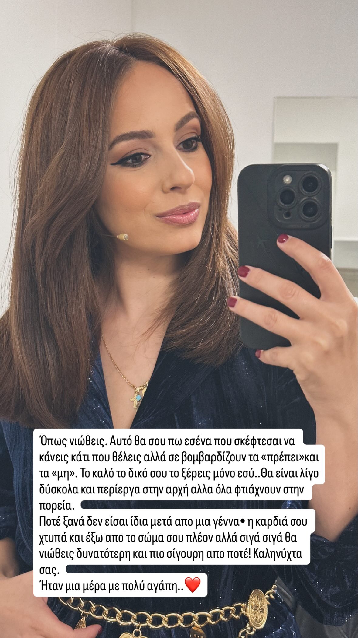 Η ίδια θέλησε να στείλει και ένα μήνυμα στους ακόλουθούς της στα social media με αφορμή την επιστροφή της στη δουλειά, γράφοντας: «Όπως νιώθεις. Αυτό θα σου πω εσένα που σκέφτεσαι να κάνεις κάτι που θέλεις αλλά σε βομβαρδίζουν τα “πρέπει” και τα “μη”. Το καλό το δικό σου το ξέρεις μόνο εσύ. Θα είναι λίγο δύσκολα και περίεργα στην αρχή αλλά όλα φτιάχνουν στην πορεία. Ποτέ ξανά δεν είσαι ίδια μετά από μια γέννα. Η καρδιά σου χτυπά και έξω από το σώμα σου πλέον αλλά σιγά σιγά θα νιώθεις δυνατότερη και πιο σίγουρη από ποτέ! Καληνύχτα σας. Ήταν μια μέρα με πολύ αγάπη...».