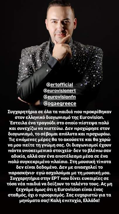 «Συγχαρητήρια σε όλα τα παιδιά που προκρίθηκαν στον ελληνικό διαγωνισμό της Eurovision.Έστειλα ένα τραγούδι στο οποίο πίστεψα πολύ και συνεχίζω να πιστεύω. Δεν προχώρησε στον διαγωνισμό, το σέβομαι απόλυτα και προχωράω.Τις επόμενες μέρες θα το ακούσετε και θα χαρώ να μου πείτε την γνώμη σας. Οι διαγωνισμοί έχουν πάντα υποκειμενικό στοιχείο: δεν το βλέπω σαν αδικία, αλλά σαν ένα αποτέλεσμα μέσα σε ένα πολύ συγκεκριμένο πλαίσιο. Στη μουσική τίποτα δεν είναι δεδομένο. Δεν με απασχολεί το παρασκήνιο, εγώ ασχολούμαι με τη μουσική μου. Συγχαρητήρια στην ΕΡΤ που δίνει ευκαιρίες σε τόσα νέα παιδιά να δείξουν το ταλέντο τους. Ας μη ξεχνάμε όμως ότι η Eurovision είναι ένας σταθμός, όχι ο προορισμός. Σας ευχαριστώ για τα μηνύματά σας! Καλή επιτυχία, Ελλάδα».