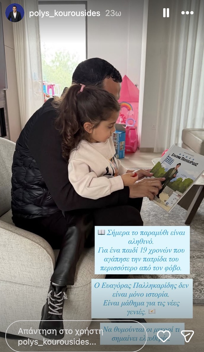 Ο υποψήφιος βουλευτής του ΔΗΣΥ Πόλυς Κουρουσίδης χάρισε στους διαδικτυακούς του ακόλουθους μια ιδιαίτερα τρυφερή και συμβολική στιγμή, αφού τον είδαμε να διαβάζει με την μικρή του κόρη το παιδικό βιβλίο «Ήρωες: Ευαγόρας Παλληκαρίδης» του Χρίστου Οικονομίδη μαθαίνοντας στην μικρή του κόρη την ιστορία του.