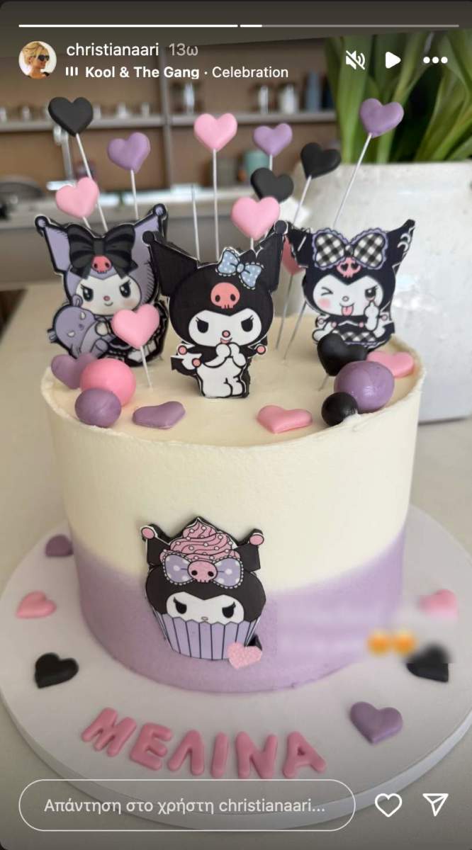 Η Χριστιάνα, μέσα από τον προσωπικό της λογαριασμό στο Instagram, μοιράστηκε το απόγευμα της Κυριακής μια φωτογραφία με την οποία μας έδειξε την εντυπωσιακή τούρτα που επέλεξε η κόρη της, Μελίνα για τα 8α γενέθλιά της. Η μικρή επέλεξε ως θέμα τον χαρακτήρα της σειράς anime, Onegai My Melody, Kuromi. Η επιλογή της τούρτας είναι ένα ακόμη παράδειγμα του character cake trend, που έχει κατακτήσει τα παιδικά πάρτι, με τους ήρωες κινουμένων σχεδίων να «ζωντανεύουν» πάνω στις τούρτες και να ενθουσιάζουν μικρούς και μεγάλους.