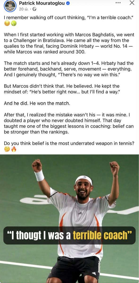 Όταν ξεκίνησα να δουλεύω με τον Μάρκο Παγδατή, είχαμε πάει σε ένα Challenger στη Μπρατισλάβα. Έφτασε από τα προκριματικά μέχρι τον τελικό, αντιμετωπίζοντας τον Ντόμινικ Χρμπάτι — Νο. 14 στον κόσμο — ενώ ο Μάρκος ήταν γύρω στο Νο. 300.
