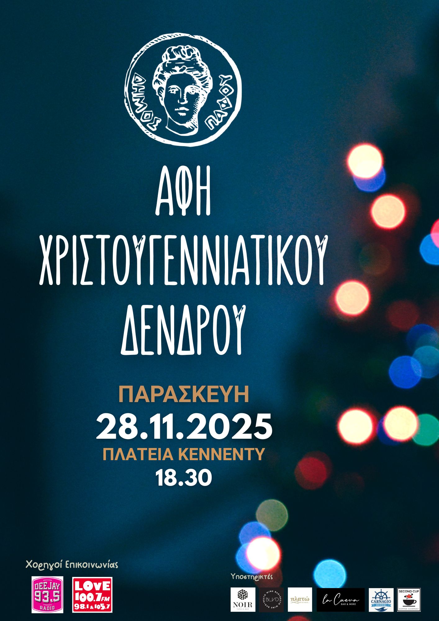 Με την καθιερωμένη Αφή του Χριστουγεννιάτικου Δένδρου, που σηματοδοτεί την έναρξη των εορταστικών εκδηλώσεων στην πόλη, η Πάφος υποδέχεται την πιο φωτεινή εποχή του χρόνου, την ερχόμενη Παρασκευή 28 Νοεμβρίου, στην Πλατεία Κέννεντυ, στο πλαίσιο μιας πλούσιας εκδήλωσης που θα αρχίσει στις 6.30 μ.μ..