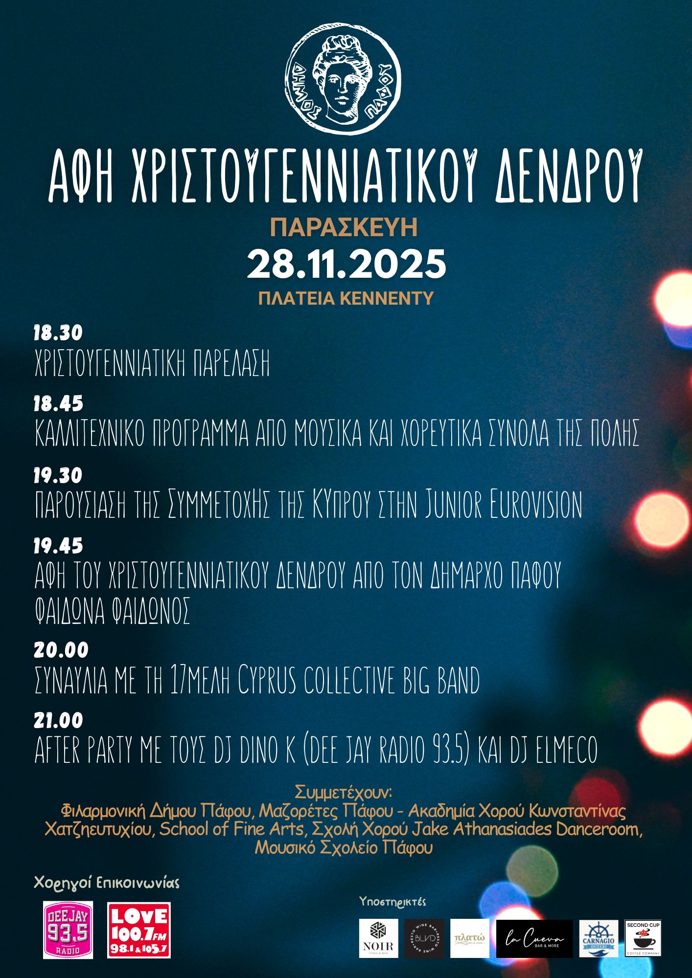 Στην Πλατεία Κέννεντυ θα λειτουργούν σπιτάκια με παραδοσιακές λιχουδιές και ζεστό κρασί, δημιουργώντας μια άξια της περίστασης εορταστική ατμόσφαιρα. Η βραδιά θα συνεχιστεί με After Party από το σταθμό DeeJay Radio 93.5, που θα κρατήσει το κέφι ζωντανό μέχρι τη 1.00 π.μ.