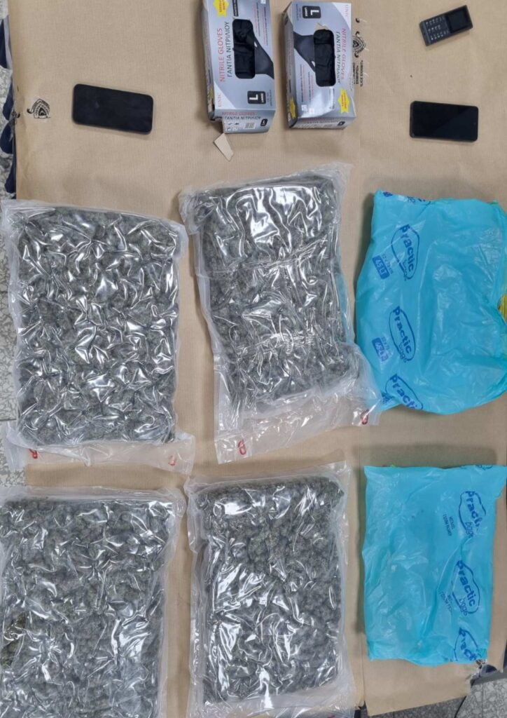 Τα μέλη της Αστυνομίας ανέκοψαν το όχημα του 35χρονου όπου εντοπίστηκε το νάιλον σακούλι που είχε τοποθετήσει προηγουμένως ο 26χρονος, το οποίο από έλεγχο που ακολούθησε, διαπιστώθηκε ότι περιείχε ποσότητα κάνναβης συνολικού βάρους 3 κιλών και 390 γραμμαρίων περίπου. Ο 35χρονος συνελήφθη για αυτόφωρο αδίκημα ενώ σε σωματική έρευνα που υποβλήθηκε, εντοπίστηκε στην κατοχή του ένας σπαστήρας εντός του οποίου υπήρχε ξηρή φυτική ύλη κάνναβης βάρους ενός γραμμαρίου, δύο κινητά τηλέφωνα ενώ εντός του αυτοκινήτου εντοπίστηκε επίσης ένα χειροποίητο τσιγάρο το οποίο περιείχε κάνναβη.
