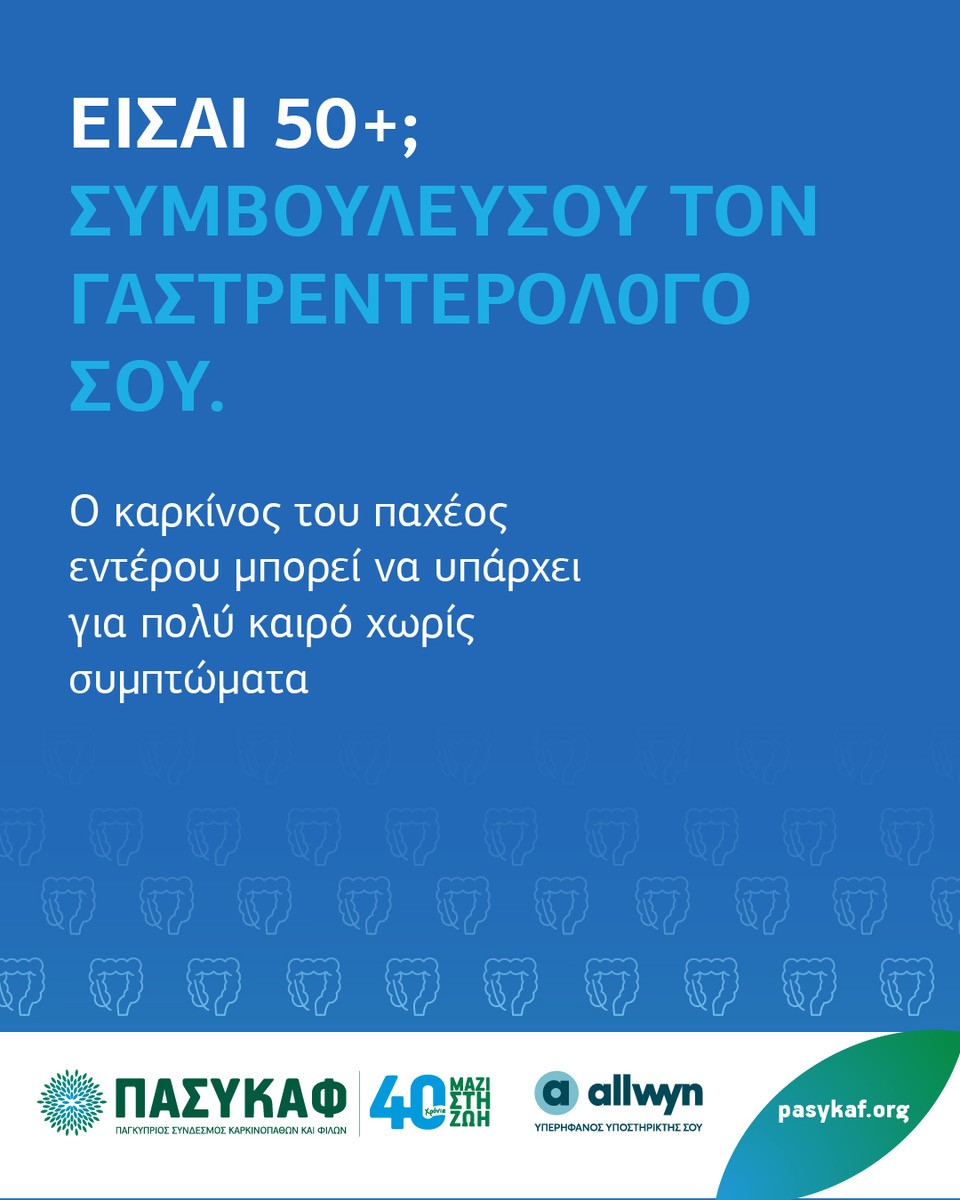Ο ΠΑΣΥΚΑΦ, που φέτος ολοκληρώνει 40 χρόνια συνεχούς προσφοράς στην πρόληψη και στην αντιμετώπιση του καρκίνου, τιμά τον Παγκόσμιο Μήνα Καρκίνου του Παχέος Εντέρου πραγματοποιώντας παγκύπρια εκστρατεία ευαισθητοποίησης.