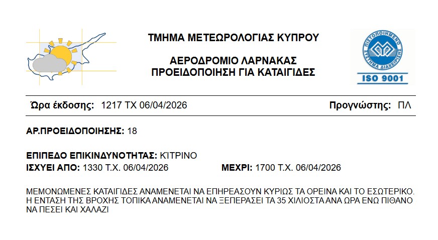 Η προειδοποίηση τίθεται σε ισχύ από τις 13:30μμ μέχρι τις 17:00μμ.
