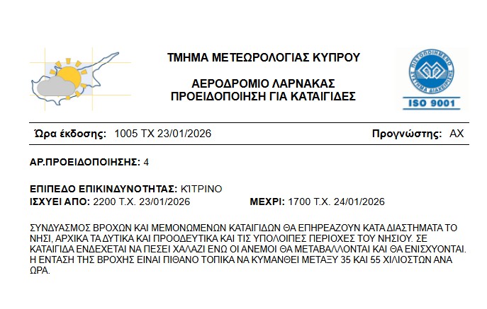 Η Μετεωρολογική Υπηρεσία εξέδωσε κίτρινη προειδοποίηση με συνδυασμό βροχών και μεμονωμένων καταιγίδων, ΄που αναμένεται να επηρεάσουν την αρχικά τα δυτικά και στη συνέχεια ολόκληρη την Κύπρο.